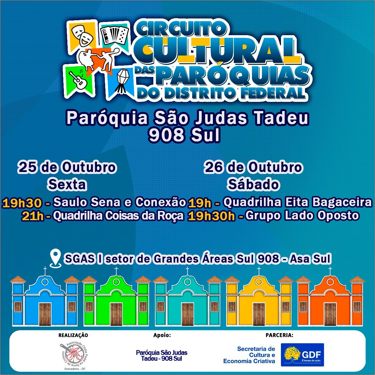 Realizado pela Associação Clube Pedal na Serra de Ciclismo do Distrito Federal, em parceria com a Secretaria de Cultura e Economia Criativa do Distrito Federal (Secec), o Circuito das Paróquias oferecerá uma programação diversa, com shows ao vivo e danças típicas, espalhadas por diversas paróquias do DF. Neste fim de semana, a festa será na Paróquia São Judas Tadeu. A entrada é gratuita e o evento é aberto a todas as idades.